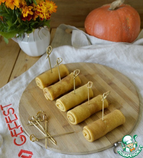 Предлагаю вам закуску из тыквенных блинчиков, фаршированных паштетом из куриной печени. Даже не ожидала, что тыква и печень, так сочетаются. Это очень вкусно!