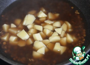 Спустя 15 минут после варки чечевицы, кладём к ней порезанный кубиками картофель. Доводим до кипения, варим 5 минут.