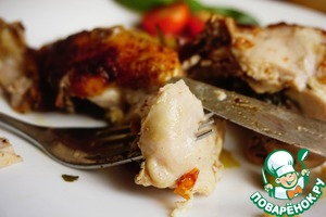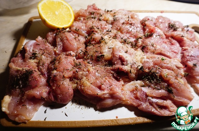 Мясо подсаливаем, перчим, поливаем лимонным соком. С тимьяна обрываем листочки и приправляем им курицу. Хорошо массируем мясо и оставляем мариноваться.