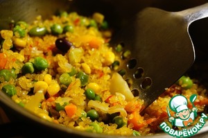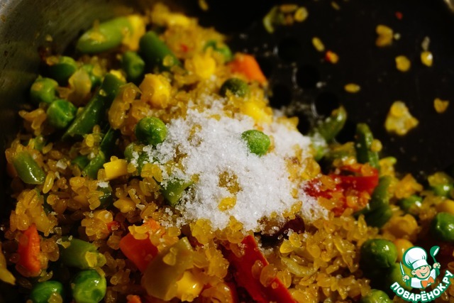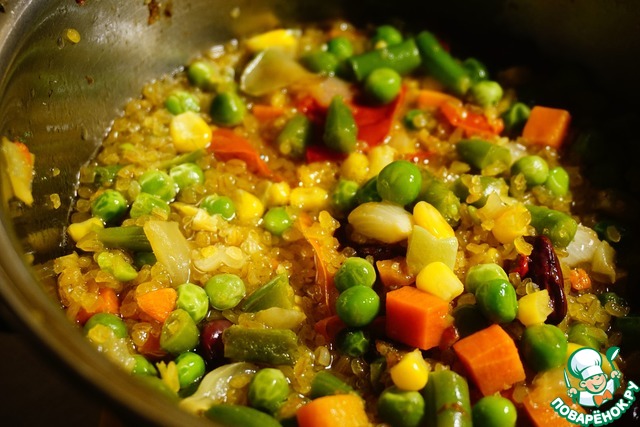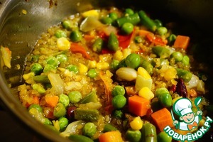 Готовим гарнир. В кастрюлю с толстым дном наливаем растительное масло, разогреваем его на сильном огне и отправляем туда замороженную мексиканскую смесь. В списках ингредиентов нет ни замороженных овощей, ни мексиканской смеси. Я указала кукурузу, но сделала пометку