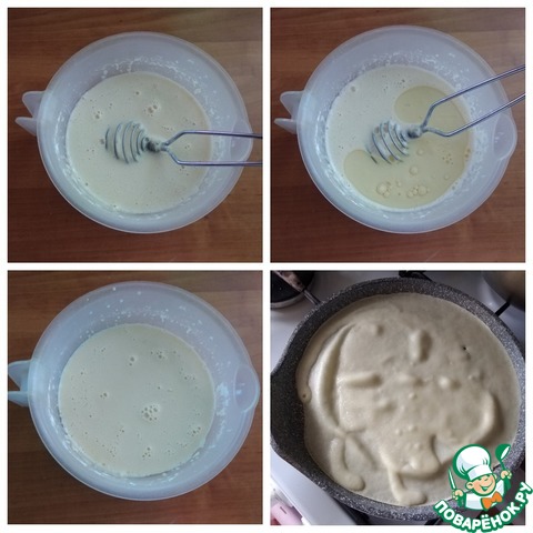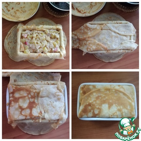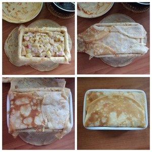 Перемешиваем и заливаем сливками. Тушим 10 минут. Начинка готова. Её нужно остудить. Пока стынет начинка, готовим подходящую форму для террина. Лучше всего взять прямоугольную и высота чтобы у неё была хотя бы 5 см. Если не гладкие стенки формы, то прокладываем её пищевой плёнкой. Укладываем в форму 4 блина (см. фото).