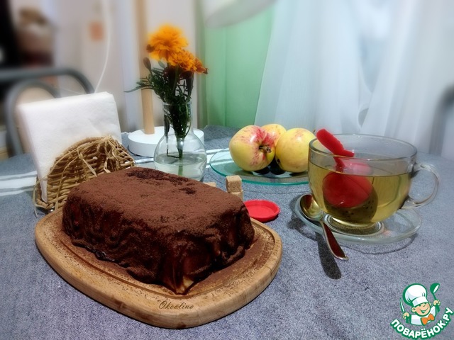 Переложила террин на доску, перевернув форму, террин легко вышел. Я обмазала верх растопленным молочным шоколадом, добавив в него сливок и присыпала какао, когда шоколад схватился. Я не ждала ночь, чтобы террин был поплотнее, мне нужен он был срочно. Подала. Вот такой красавец.