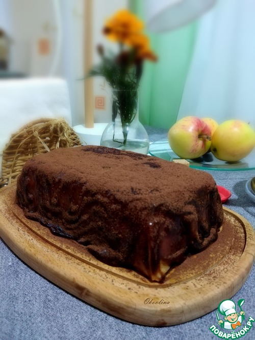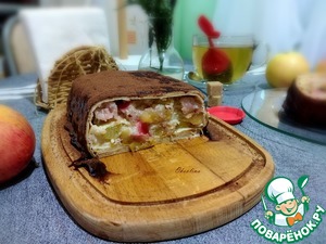 Террин, сделанный из классических очень тонких блинов на молоке без добавления соды и разрыхлителя. В начинку взяла местные яблоки и кабачок, приготовленные на сливках с корицей и ванилью. Террин покрыла молочным шоколадом и какао.
