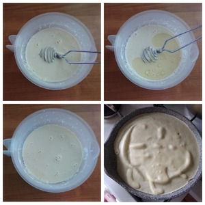 Доливаем оставшееся молоко. Тесто должно быть очень жидким. Кладём щепотку соли и наливаем масло подсолнечное. Масло нужно для того, чтобы не подмазывать каждый раз сковороду при выпечки очередного блина. Тесто готово. Начинаем выпекать блины. Для замешивания теста я всегда использую посуду с носиком. Очень удобно будет наливать тесто из такой посуды. Греем сковороду. У меня сковорода D-24 см. Для выпечки первого блина я всё-равно подмажу сковороду, т к тесто очень жидкое. Разлила тесто по сковороде ровным тонким слоем, наклоняя сковороду из стороны в сторону. Выпекала блин с одной стоны до красивого румяного цвета и лопаточкой попробовала как блин схватился.