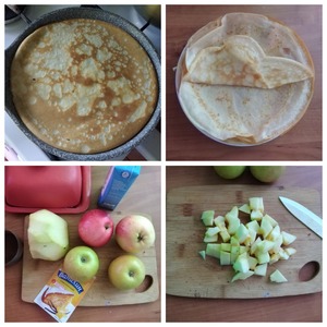Легко перевернула. Из этого количества теста у меня получилось 7 блинов D-24 см. Делаем начинку. Кабачок почистила и нарезала небольшим кубиком. Яблоки у меня местные и кожица у них не толстая, я её не срезала. Террин можно сделать с одними яблоками.