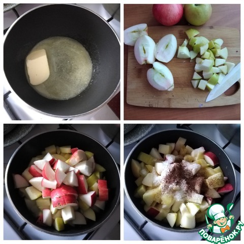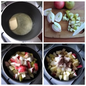 В сотейнике растапливаем сливочное масло. Яблоки тоже нарезаем кубиком как и кабачок. Выкладываем кабачок и яблоки, добавляем сахар и тушим 5 минут. Добавляем корицу и ваниль.