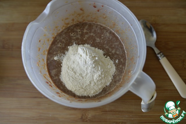 Кладём муку, перемешиваем, оставляем на 30 минут для набухания муки.