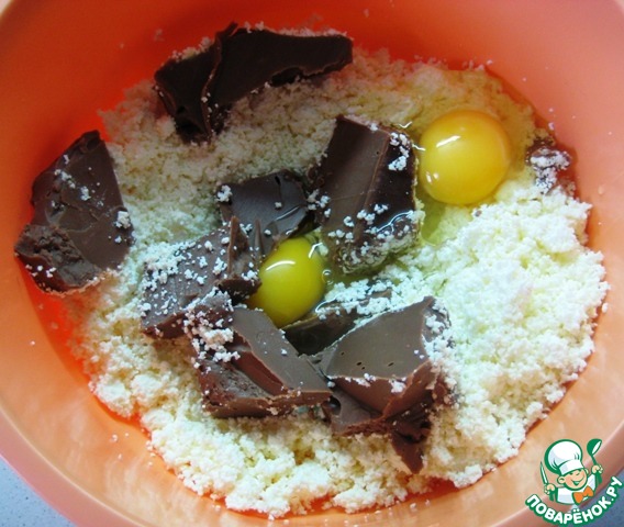 В миске соединить творог, мягкое шоколадное сливочное масло и яйца. Перемешать.