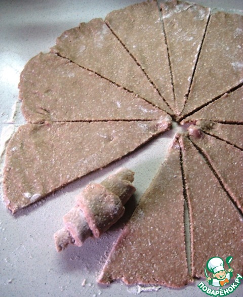 Разрезать на кусочки и свернуть рогалик. Также раскатать, разрезать и свернуть рогалики из второй части теста.