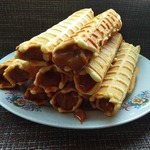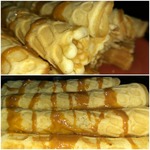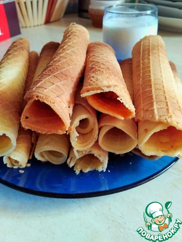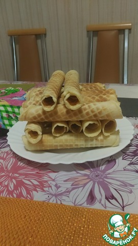 Яйца взбить с сахаром и ванилином, добавить растопленный маргарин и муку, замесить тесто. Выпекать в электровафельнице, выкладывая по 1 ст. ложке на середину. Ещё горячими быстро свернуть в трубочку