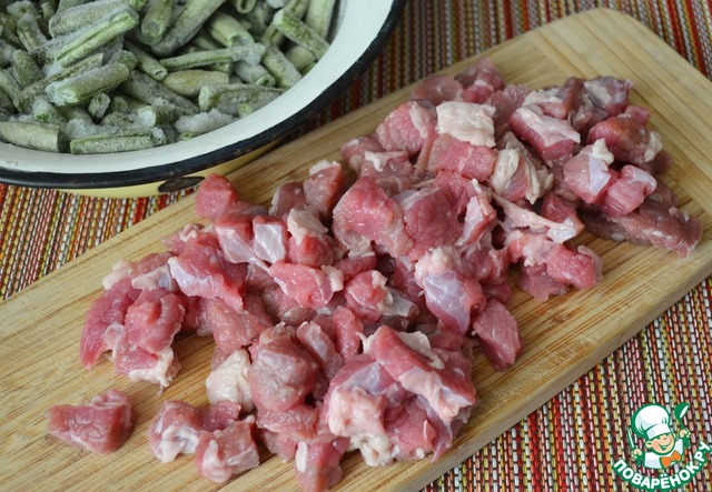 Мясо вымыть, обсушить, нарезать кусочками, 1,5 см.. Лук почистить, нарезать перьями, размораживать фасоль.