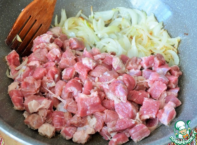 В сковороде разогреть 2 ст. л. растительного масла, выложить лук, жарить пару минут, огонь выше среднего, добавить мясо, посолить, жарить на среднем огне, минут 10.