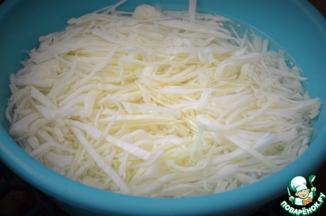 Капусту нашинковать тонко, переложить в миску, залить кипятком на 5 минут.