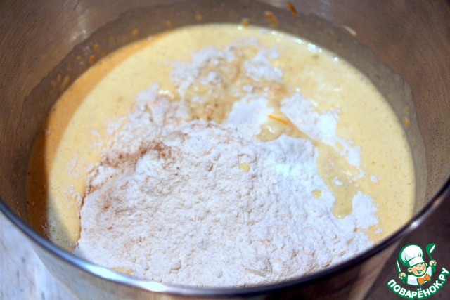 Ввести все сухие ингредиенты и перемешать, в конце добавить сок и цедру половины апельсина и молотые грецкие орехи.