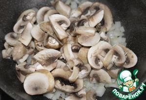 Лук и грибы должны слегка зажариться. Убираем лук с грибами.