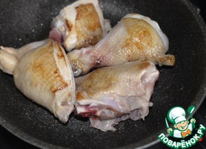 Суп можно варить в сотейнике, глубокой сковороде или казане. Берём курицу, у меня окорочок, моем, режем на порционные куски, кладём на разогретую сковороду (сотейник) кожей вниз, без масла, зажариваем до румяной корочки с обеих сторон.