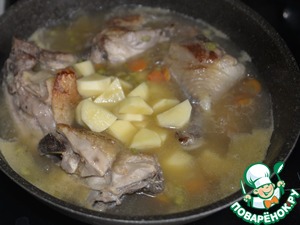 Заливаем кипятком. Количество воды зависти от желаемой густоты супа, у меня около 2 л. Кладём порезанный кубиками картофель, доводим до кипения.