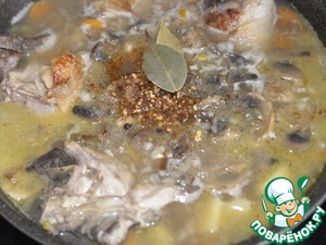 Добавляем жаренные грибы с луком, соль, смесь перцев, лавровый лист. Варим суп до готовности на среднем огне около 15 минут.