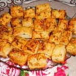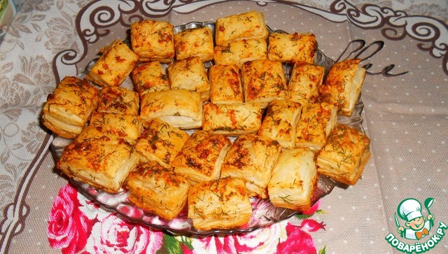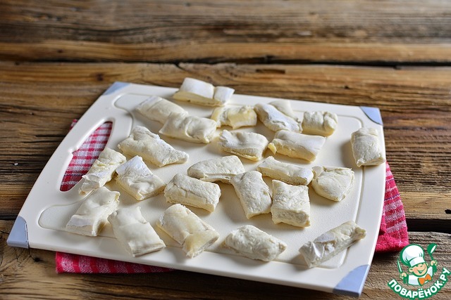Отлично подойдет оставшееся от чего-то слоеное тесто, которое нужно порезать на кусочки небольшого размера.