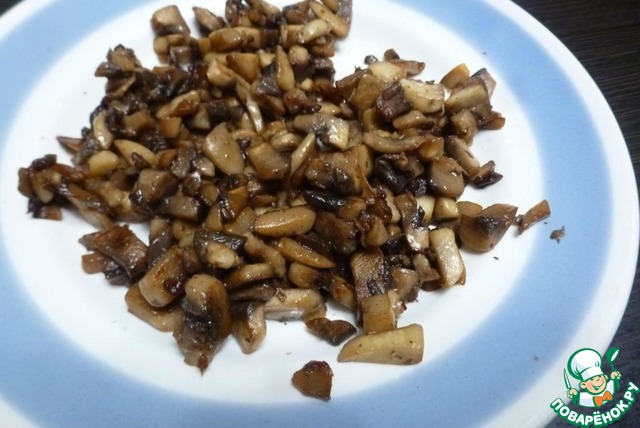 Шампиньоны нарезать кубиком и обжарить на той же сковороде, где обжаривали лук. Как только выпарится влага, снимайте с огня. Грибы лучше не зажаривать, пусть они будут слегка сочными.
