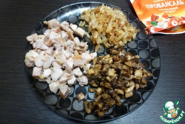 Когда лук и шампиньоны остынут, соединить их с нарезанной куриной грудкой. Добавить кубики ананасов.