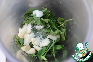 Берем зелень, чеснок, соль и 4ст. л. растительного масла и измельчаем блендером.