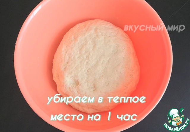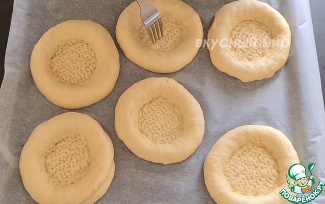 Разделим тесто на равные 6 частей. Каждую скатаем в шар и формируем лепешки. Придавим большим пальцем в середине и начинаем постепенно растягивать, формируя бортики. Вилкой сделаем проколы. Оставляем еще на 20мин