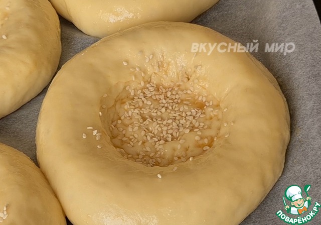 Смажем яйцом и посыпаем кунжутом. Выпекаем в духовке 180° 20-25 минут