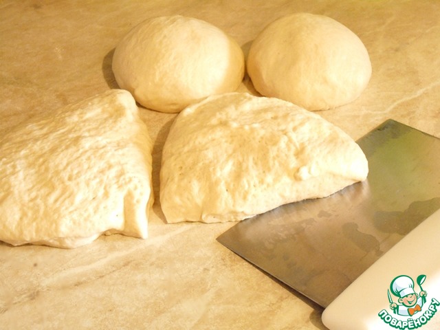 Тесто увеличилось в объёме в два раза, рабочую поверхность и руки смазать растительным маслом, выложить тесто из миски, разделить на подходящее количество, я разделила на четыре части. Каждую часть обмять и подкатать в колобки. Слегка смазать маслом, накрыть пленкой, дать тесту отдохнуть и подняться.