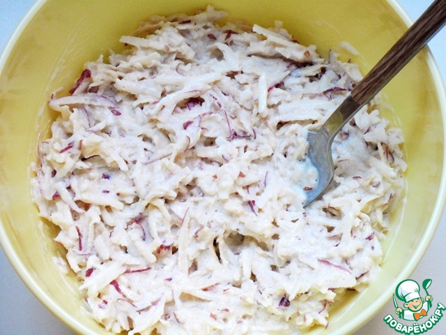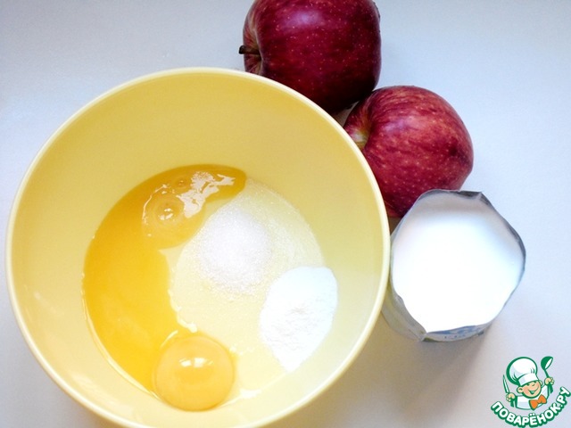 Яблоки очистить от семенных коробочек, натереть крупной "стружкой", отжать сок и хорошо перемешать с яично-сметанной смесью.