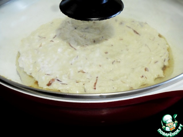 Накрыть крышкой и запекать на малом огне 5 минут. Следите за температурой, чтобы низ не пригорел.