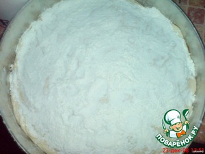 Смазать глубокую миску растит. маслом,положить в нее тесто и накрыть полотенцем оставив на 1 час в теплом месте.Через час тесто выложить на посыпанный предварительно стол мукой и также осторожно его замесить.Еще раз тесто положить в глубокую посуду, посыпать щедро мукой и поставить еще на 1 час в теплое место.