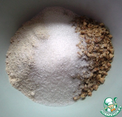Для овсяно-ореховой крошки: соединить в миске овсяную муку, измельченные грецкие орехи, сахар, щепотку соли и ванильный сахар. Перемешать.