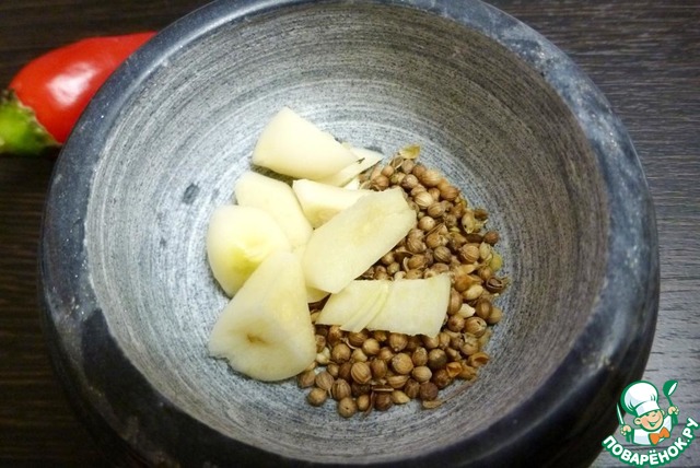 В ступке размять кориандр и уцхо-сунели вместе с чесноком. Влить в массу виноградный (или яблочный) уксус.
