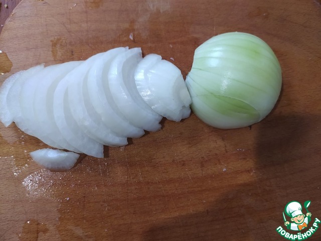 Лук нарезаем полукольцами и отправляем жариться на сковороде до золотистого цвета.