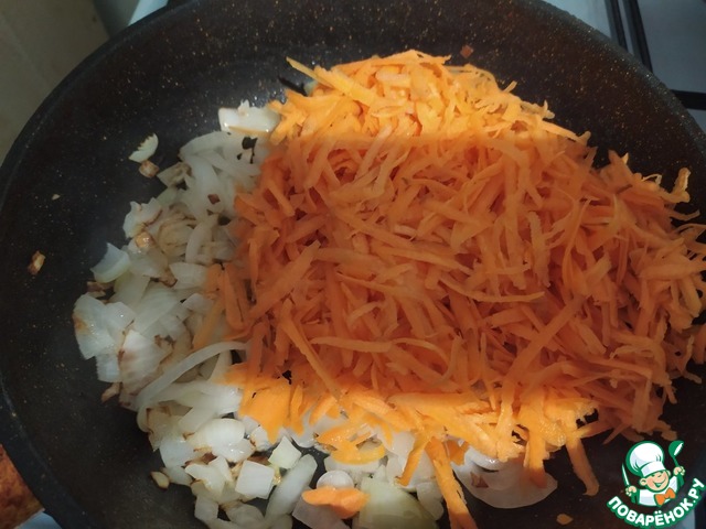 Морковь трем на купной терке и добавляем к луку. Жарим до полуготовности.