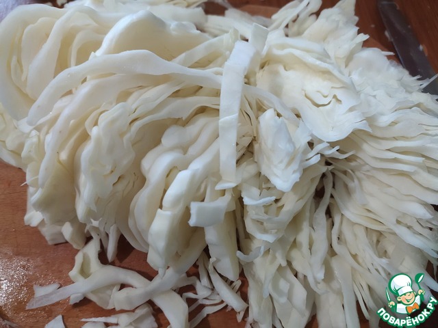 Мелко нашинкуйте капусту при помощи ножа или кухонного комбайна. -