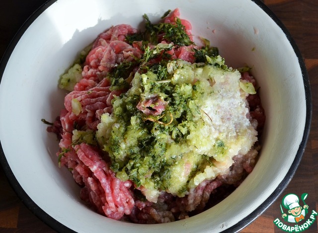 Через мелкую решётку мясорубки пропустить говядину, лук, чеснок и зелень.