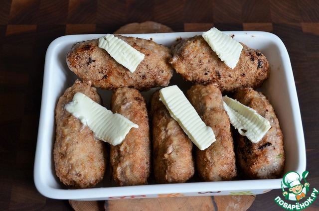 Перенести котлеты в огнеупорную форму, добавить сливочное масло и довести до готовности в духовке, 10 минут при 190 градусах или в СВЧ - мощность 800-1000 Вт., 2 - 4 минуты.