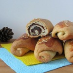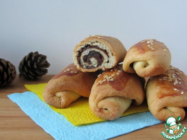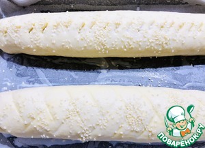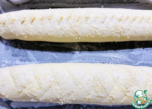Смазать молоком, посыпать кунжутом, украсить по вашему вкусу. Я надрезала ножницами, второй рулет обратной стороной ножа сделала полоски.
