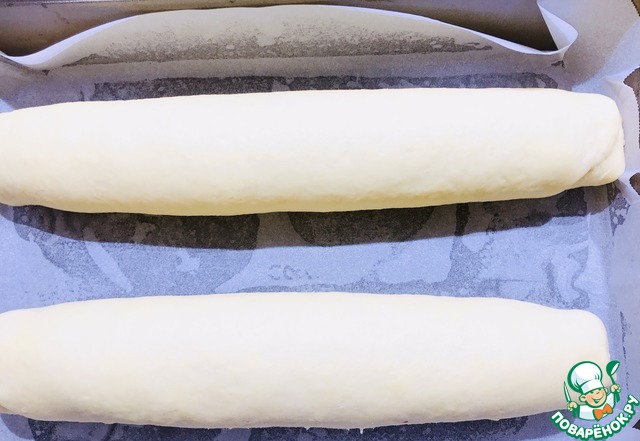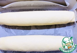 Скрутить в рулет, выложить на противень застеленной пекарской бумагой. Также приготовить второй рулет.