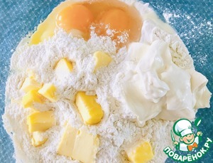 Для теста -все ингредиенты смешать в чаше - мука, разрыхлитель, мягкий маргарин, сахар, яйца и сметану.