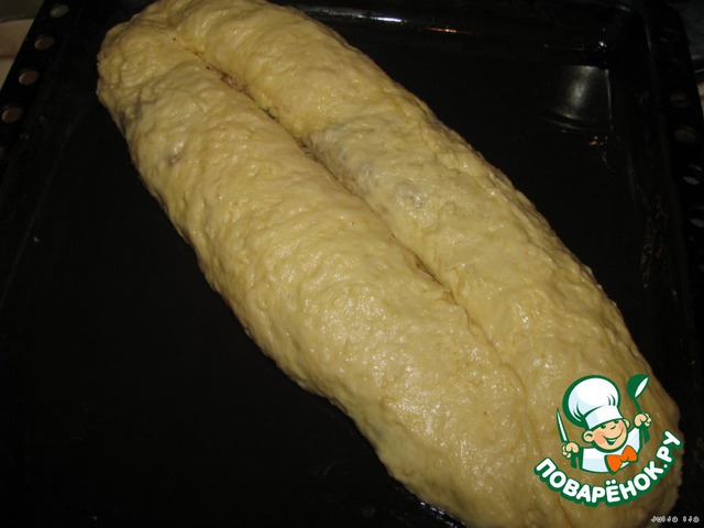 Вот такая коврижка у меня уже на противне, смазанном сливочным маслом. Разогреваем духовку до 200 градусов. Противень лучше немного подержать в духовке, чтобы он был тёплым. Оставляем минут на 20 для расстойки.