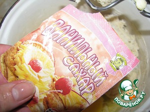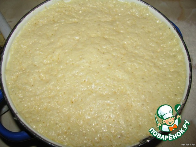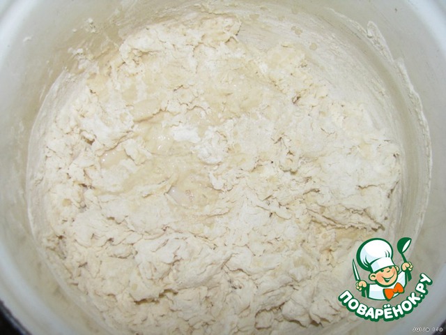 В муке сделать углубление и вылить туда смесь дрожжей и молока. Дать постоять 20 минут. Потом смешать.
