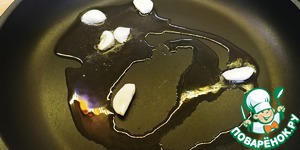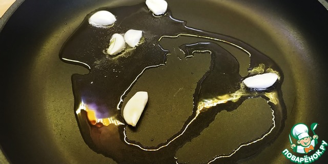 Наливаем на сковороду оливковое масло и кладем чеснок. И острый перчик, я его не использовала.