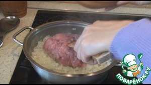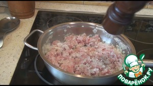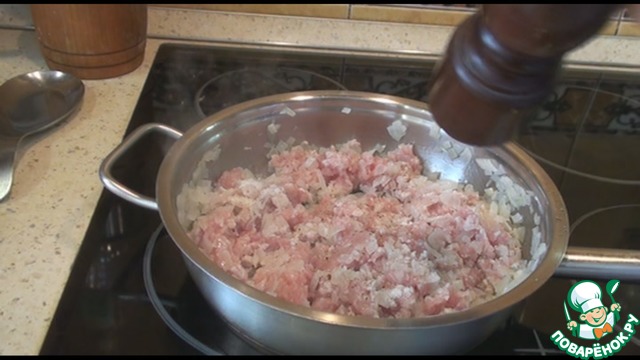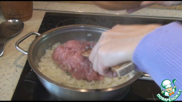 На небольшом количестве растительного масла обжарим мелко нарезанный лук до прозрачности. Выкладываем фарш. Фарш можно брать любой, свиной, куриный, говяжий.