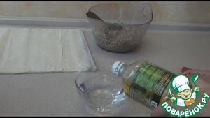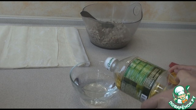 Тесто фило разморозим. В мисочку нальём газированную воду, добавим растительное масло, перемешаем.