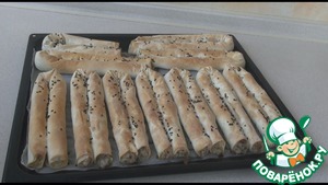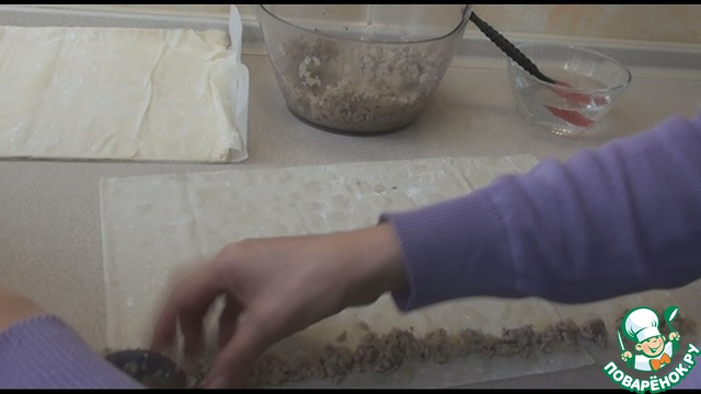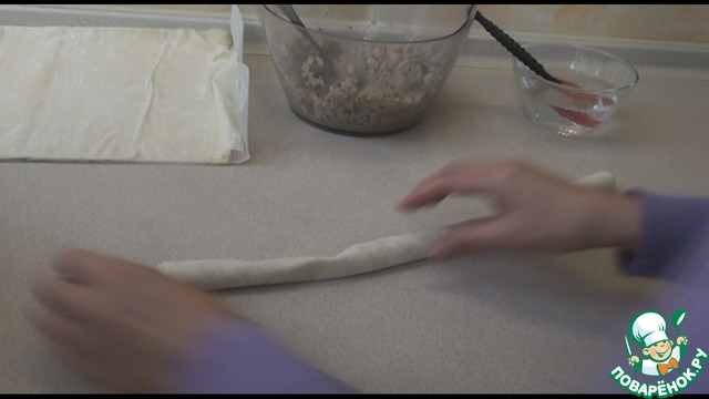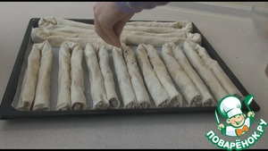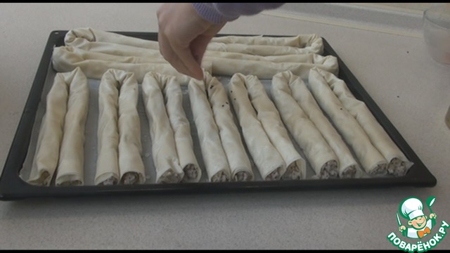 Заворачиваем рулетиком и формируем роллини. Выкладываем на застеленный пергаментом противень.