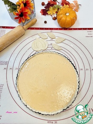 Раскатанное тесто переложить в форму и сформировать бортики. Из остатков теста можно вырезать листочки, цветочки, тыквочки и т. д. для украшения тарта.