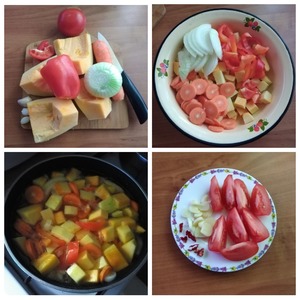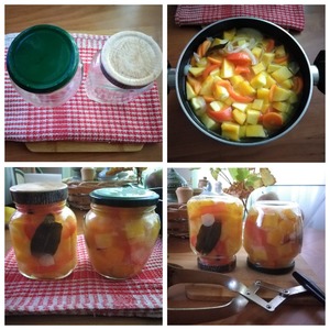 Этого количества овощей на 3 банки ёмкостью 0,5 л. Банки нужно простерилизовать. Я это делаю в СВЧ 10 минут при мощности 800, налив в помытые банки до половины воды. Крышки прокипятим. Раскладываем овощи с тыквой по банкам. Накрываем крышками и стерилизуем 10 минут, закрываем и переворачиваем. Даём остыть перевёрнутыми. У меня получилось 3 банки по 0,5 л. Две я закрыла герметично и одну оставила поесть сразу.